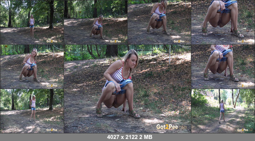 Today_s update on Got2Pee features a cute blonde who is walking in the forest. She looks around to see if anyone is around since she is suffering with pee desperation. After checking, this hottie pulls down her denim hotpants and squatting to pee she sprays her golden juices down onto the ground