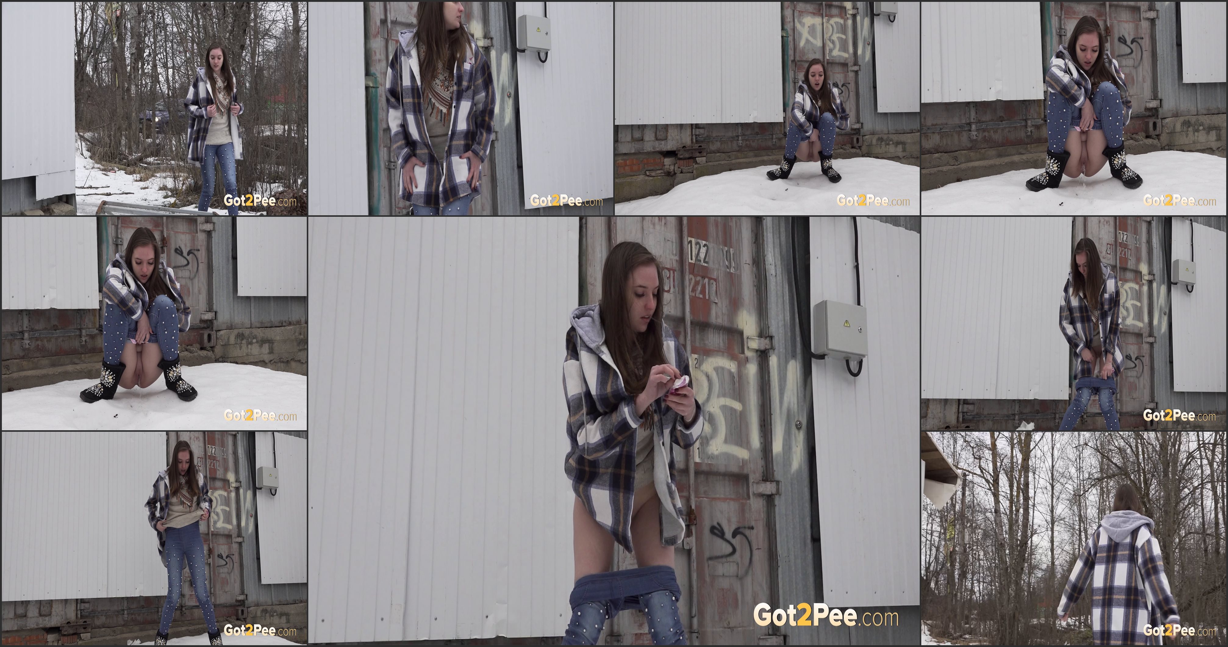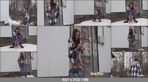 Watch our newest public pissing scene as a sexy brunette walks carefully away from a busy road in the snow. She holds onto her crotch as she needs to relieve her piss desperation and as she stops behind an industrial unit in the suburbs, this hottie squats and pees down onto the snow