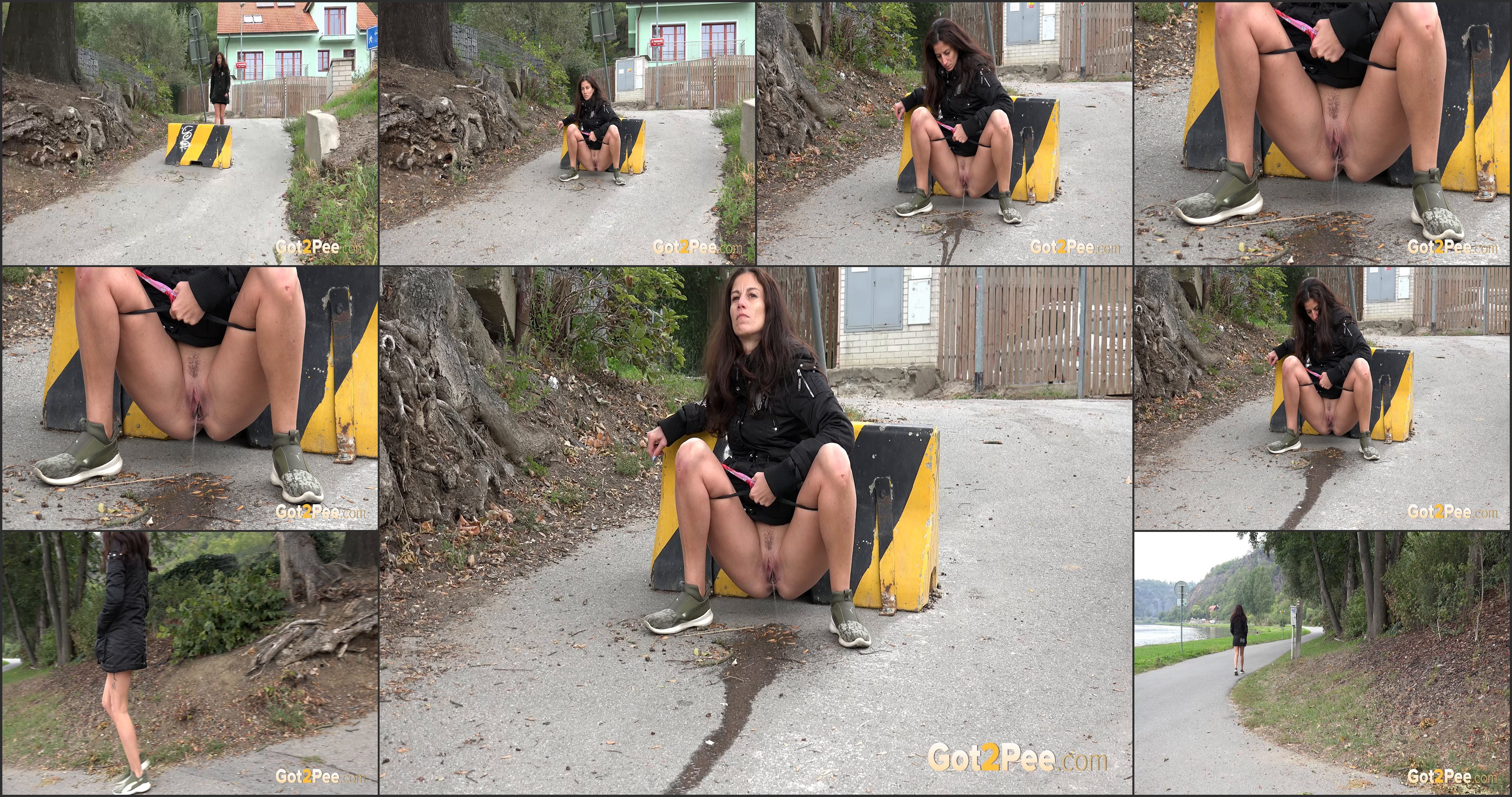 Today on Got2Pee, gorgeous brunette Ali walks by some houses and decides to relieve her piss desperation. She stops by a bollard and pulls down her panties before showing off her trimmed pussy and her neat piss stream as it hits the ground Her pee stream trickles down the road and this brunette pissing simply pulls up her panties and continues on her way once she has finished