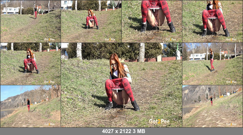 A sexy redhead in tartan leggings rushes down a grassy bank so that she can relieve her piss desperation. Squatting to pee, she holds her pussy while spraying her golden juices down onto the ground in this public pissing scene Once she has finished, this hot babe shakes the final pee droplets off and pulls up her leggings before walking along the river.