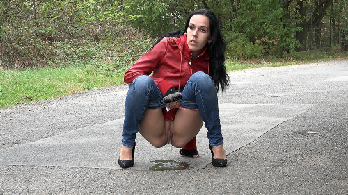 Dark haired Angel wraps up our week of updates here on Got2Pee today and she walks on a quiet road in the suburbs wearing denim jeans and a red leather jacket. Feeling piss desperation setting in, she decides to relieve herself so squatting to pee, sprays a huge puddle of piss down onto the ground