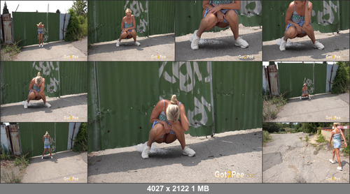 Blonde Victoria Pure is in the city near an industrial area and runs down a slope uncomfortable with piss desperation. She stops in front of a makeshift fence and squatting to pee she lets her piss stream flow down and hit the ground. You can see the look of relief across her face as she empties her bladder while we film it all for Got2Pee